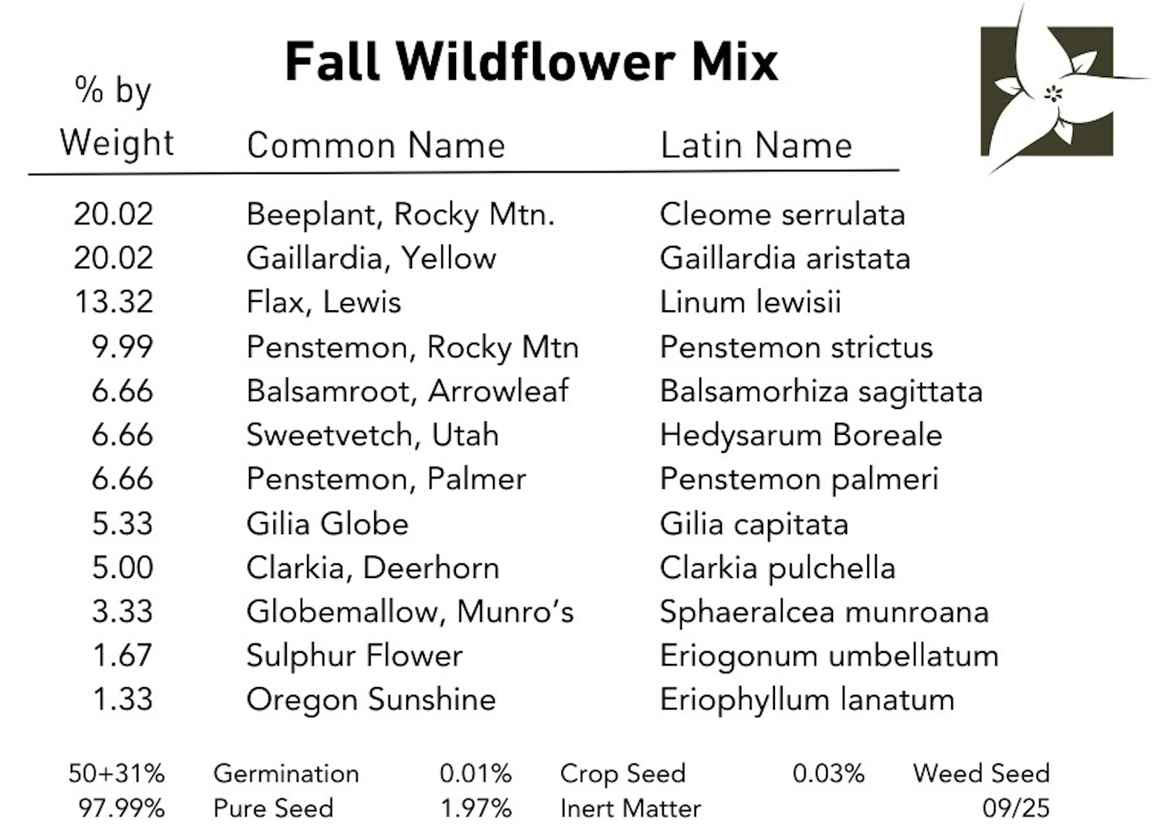 Best for Fall sowing, this beautiful wildflower mix contains: Rocky Mountain Beeplant (Cleome serrulata) Yellow Gaillardia (Gaillardia aristata) Wild Blue Flax (Linum lewisii) Rocky Mountain Penstemon (Penstemon strictus) Arrowleaf Balsamroot (Balsamorhiza sagittata) Utah Sweetvetch (Hedysarum boreale) Palmer Penstemon (Penstemon palmeri) Globe gilia (Gilia capitata) Clarkia (Clarkia pulchella) Munro's Globemallow (Sphaeralcea munroana) Sulphur Flower (Eriogonum umbellatum) Oregon Sunshine (Eriophyllum lanatum) Total weight: 1/4#