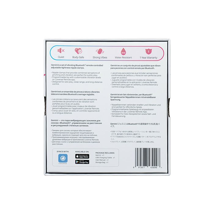 Meet Gemini - the world's first app-controlled adjustable vibrating nipple clamps. Wear Gemini however you want. Carry them discreetly and go out for new adventures. From foreplay to roleplay to light BDSM, you can incorporate our nipple clamps into your routine with the Lovense Remote app! Enjoy the perfect combination of clamps and vibrations.
